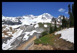Rick and I hiked from Longmire to Mowich Lake on the Wonderland Trail in Mount Rainier National Park over 4 days in mid-July, 2010. We camped at Devil's Dream the first night, South Puyallup the second and Golden Lakes the third night and hiked 6, 6, 12 and 10 miles daily with a cumulative elevation gain of just over 10,000'. Perfect weather, lots of magnificent forest, beautiful flowers, a few other hikers and quite a bit of snow above 5000'.