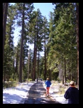 Day 3 of the Tahoe Triple is the official Lake Tahoe Marathon. It runs on bike trails and highway 89 along the west shore of Lake Tahoe south from Tahoe City to South Lake Tahoe through mostly mature forest and a few small towns. While the northbound lane of the highway was closed to most traffic the southbound lane was packed with cars and busses for most of the race. Very scenic course with a couple of big hills between miles 14 and 20 but no net elevation change. One to two inches of snow fell the night before the race so the course was icy and snowy in shady places. I was surprised how fast I ran, taking 10 minutes of my time from day 2.
