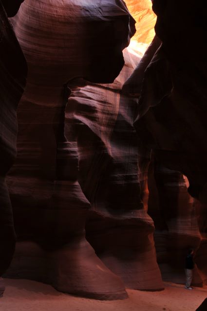 Like Lower Antelope, Upper Antelope is not much of a hike but the upper canyon is deeper, darker and more spacious inside than the lower. Dark walls accentuate the intense colors of the light overhead, hot yellow and orange; gaps allow orange, red and magenta to pour down into the caverns below where knots of photographers fiddle with tripods and exposures as guides point out cute formations with names like the Chief and the Shark. "Stand here and aim your camera there", they say, and so we do, but we'd rather be left alone to capture our own memories of a stunning place.