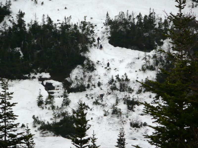 Whit, Fred, Jane and nephew descending an unskiable section of the lower headwall. Much steeper than it looks in this telephoto shot.