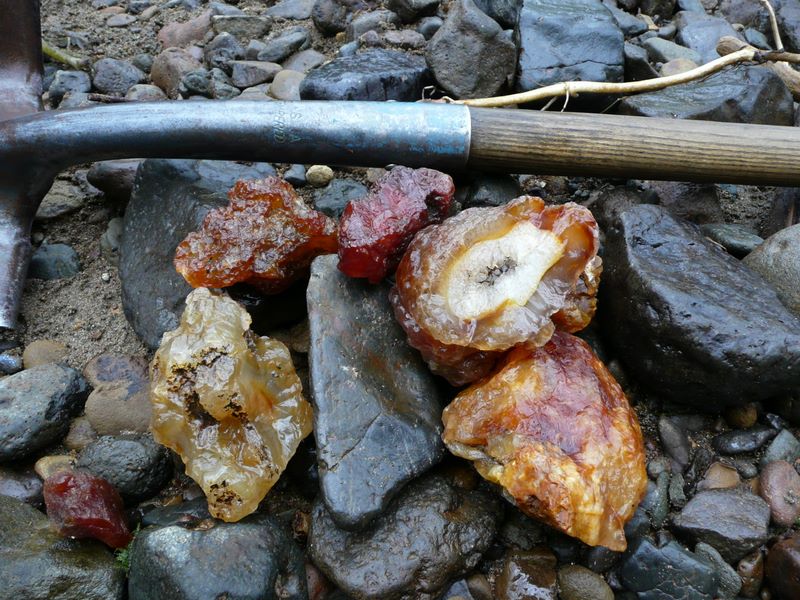 Lucas Creek drains the hills north of Hwy 12 east of Centralia, WA. Agates from the area are impressive but scarce. They weather out of gravel and clay layers cut by the streams but are too rare to find by digging. Like most carnelian agate, the red color is usually only near the surface or along cracks. For photos of agate collected after the 2009 mudflow, see