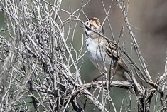 In the morning we drove south through a broad arid valley with naked in-your-face geology in all directions and I kept wondering how old it all was, not so much the rocks themselves as the landscape - the mountains, the cliffs, the mesas, the flat valley floors - and how this dramatic landscape developed. Lots of questions, no way to ask them. We stopped briefly east of Green River to look for birds but found few. At the entrance to Arches National Park we stopped again and considered taking the scenic drive but did not have reservations. Darchelle photographed Sparrows from the parking lot instead.