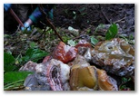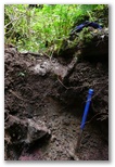 I dug down about 2' to the pink/orange ash then worked horizontally following a thin layer of rusty yellowish gravel sandwiched between the ash below and a layer of miry gray and/or orange clay above. Above the miry clay is about a foot of brown muddy clay and above that, about a 6" layer of humus-rich soil. Most of the agate lies in the gravel layer though the miry clay contained some agate as well as larger chunks of crystal, and agates are sometimes embedded in the pink ash. The agates do not appear to have been worn by transport. Most of the smaller nodules are intact but the larger ones are usually broken or at least chipped, and most of the crystal chunks appear to be fragments of much larger geodes. Mingled with the agate are chunks of basalt. Rounded by weathering, they occur at all levels from the pink ash up to near the surface and they range in size from pebbles to boulders too heavy to move.