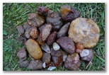 Around mid-afternoon Pat heard voices down in the woods below us. When we hiked down to investigate we found two old guys (like us) and a young man digging in an area with quite a few other holes around. The soil was softer with fewer chunks of the rough basalt host rock than where we were working, but though the digging was easier they only had about half as many eggs as we did, and no big ones. We invited them up to see what we'd found; on the way back up I picked up two nice eggs just sitting on the ground amidst the piles of basalt. They were impressed with Pat's pile, and with good reason; he had close to a five-gallon bucketful. Towards the end of the day I dug some in another hole just below Rock Harn's old hole where he found the 400lb agate. The digging was easy there. I got into an area of loose gravel and though I found only two larger eggs I was scraping out little eggs every couple of minutes, so I had a good time.