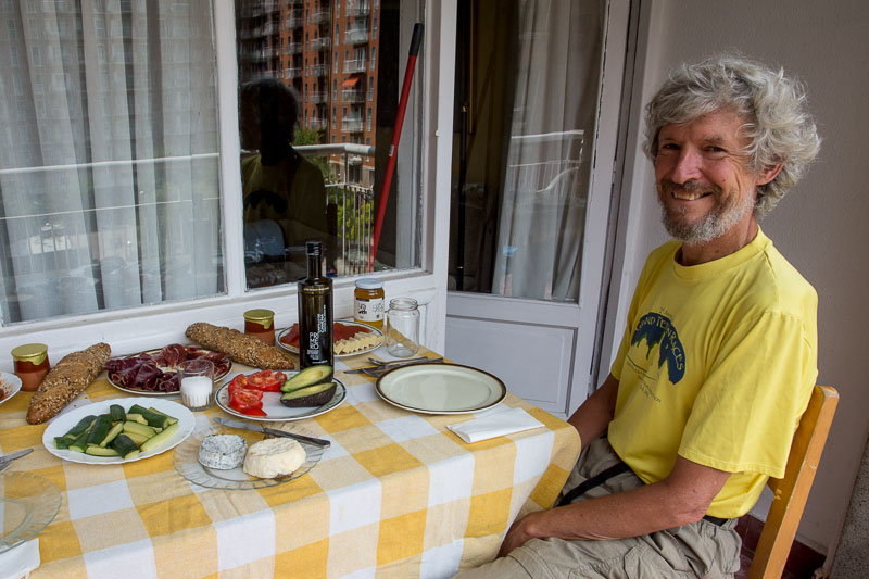We spent a lazy day in the apartment. Instead of going for a hike we went shopping at the local market and bought an intriguing variety of cheeses and meats for lunch. It was a delicious lunch - Jamon deIberico (ham), Cecina de Leon (cured beef), Quince preserves, a nice and dry yet inexpensive Cidre (hard cider), a couple stoneware cups of Cuajado (sheep's milk yogurt), two soft and one hard cheese whose names I never knew and a plate of steamed zucchini (fresh and less than a euro/kilo) along with a loaf each of seed-encrusted whole-wheat bread.