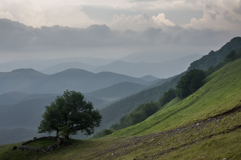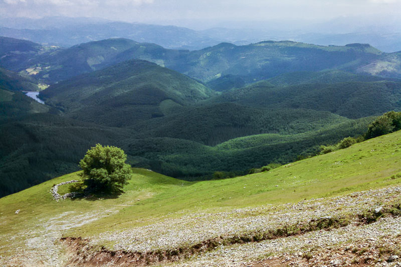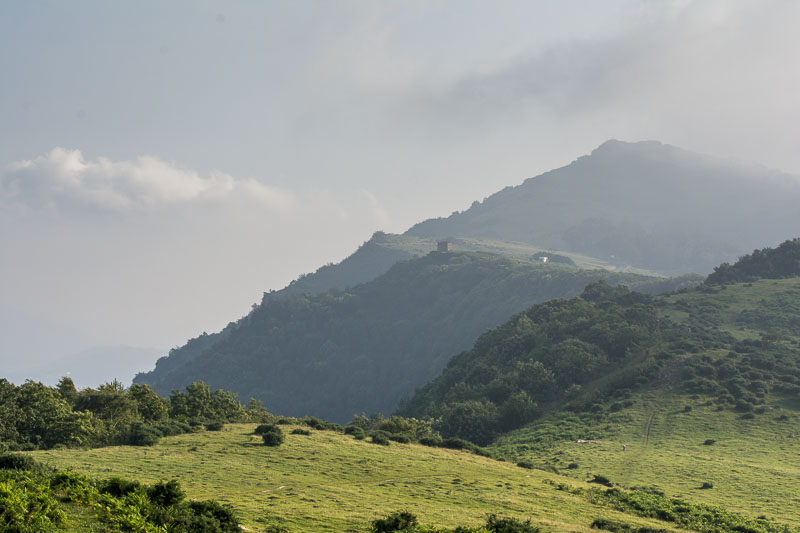 At the summit of the peak, named Arbelaitz on the map, we stopped for a quick lunch while we considered the daunting prospect of traversing the rough knife-edge ridge between us and the fog-shrouded summit of Aizkorri. Tall cumulus clouds to the south shaded the valley below and fog played around Aizkorri, a kilometer to the east but only fifty meters above us. Even as we ate lunch the largest of the clouds overshadowed us and began spitting big raindrops. We both had doubts about continuing but I nonetheless led the way another fifty yards or so forward until the first thunderclap turned us back. Had we caught the train an hour earlier we probably would have been on Aizkorri when the storm developed and would have had to beat a hasty retreat far down into the valley then climb back over the ridge again in fog and rain. The fog closed in behind us as we dropped off Arbelaitz and shrouded our route all the way back to the big meadow at the top of the mine road.