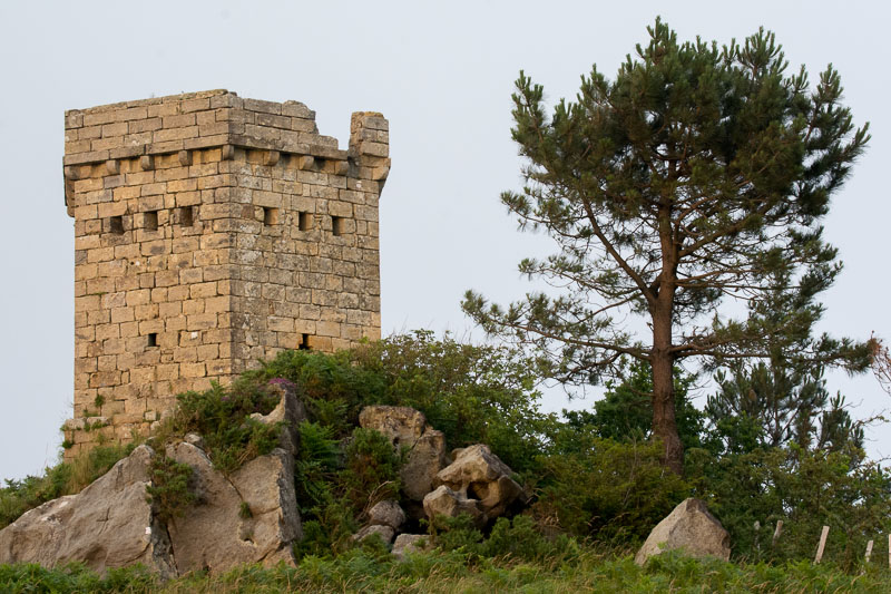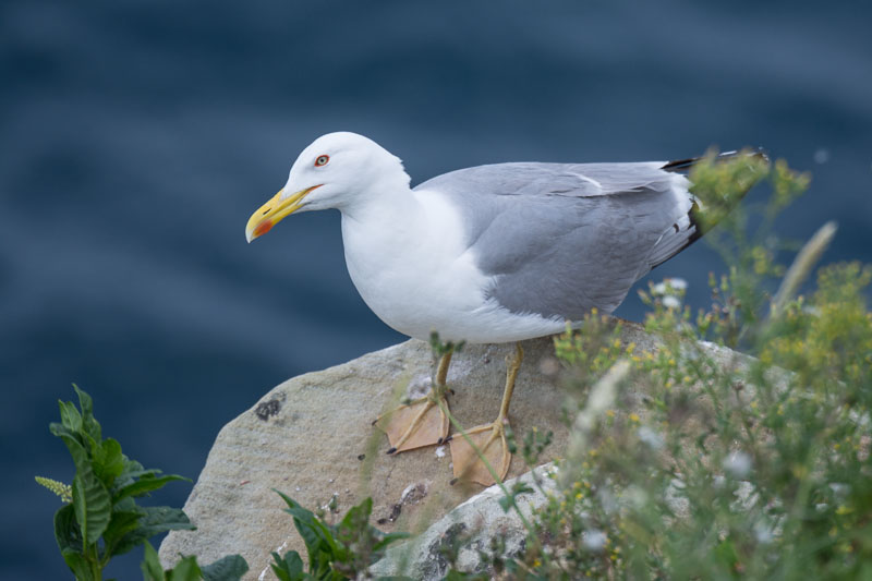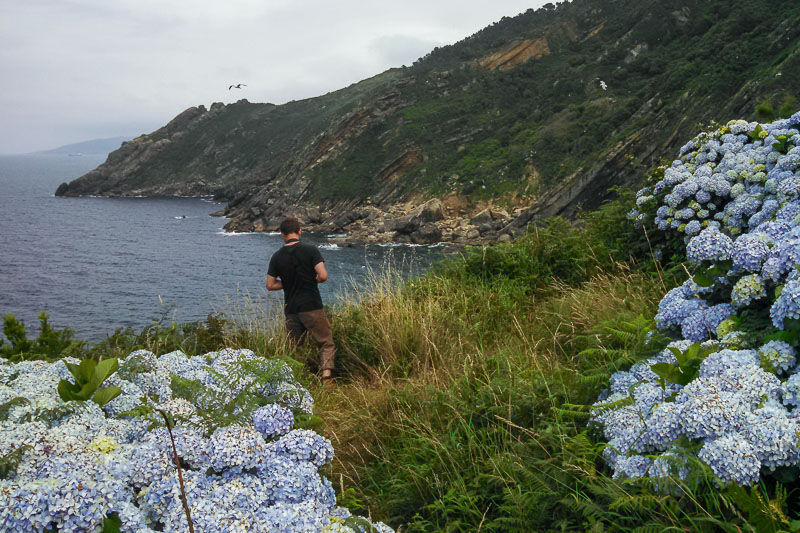 Attempting to get down to the point, we explored some of the smaller trails that branch off the main trail. Some led only to secluded little picnic spots tucked away in the thickets but eventually we found the route down to the point, and even better little "picnic" spots. Unemployment among young people is very high in Spain so unable to afford places of their own, or even shared with friends, many live with their parents. Privacy, particularly for sexual trysts, is at a premium and we speculated that that might be the reason we passed so many little picnic spots hidden in the bushes. Some even had little piles of condom wrappers by their entrances. Fortunately all were unoccupied at midday on a Tuesday afternoon. The very best spots were down on the point, enclosed by colorful hedges of pink and blue hydrangeas and opening out to the ocean for spectacular views of sea cliffs with Yellow-legged Gulls wheeling overhead. Getting there wasn't easy; the trail skirted precipitous overlooks and meandered through old stone forts, but the destination was worth the trouble.