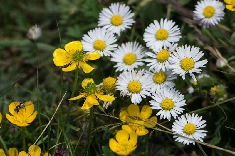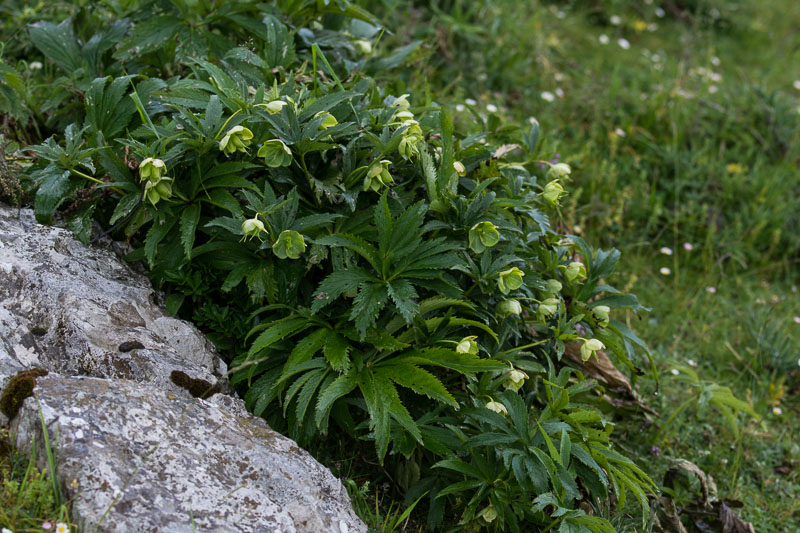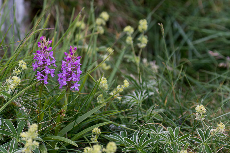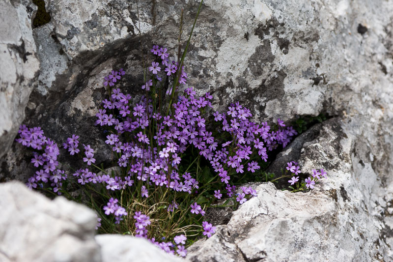 Wild thyme, white fleabane, yellow buttercups and cinquefoil, white pinks, a pink penstemon and a yellow and orange pea were all common. Few flowers were more than a couple of inches tall. We passed an occasional clump of green-flowered Hellebore, their leaves mostly reduced to filagree (by insects I assume; the sheep don't seem to touch it). Up in the crags we also found an orchid with a spike of pink flowers, a very fragrant yellow Erysimum, and some flowering Pinguicula, perhaps the same species that the boys and I first saw on Big Snow Mountain in Washington some years ago.
