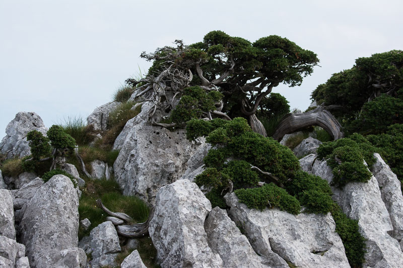 We made the train but not the peak. It had been sunny and warm, a cloudless morning, when we started up. We followed a paved road up past meadows and small groves of trees to a reservoir, crossed on the dam and followed logging roads up into the woods. The native forest had probably been mostly hardwoods dominated by oak and chestnut but much of the lower hill country has been planted to small groves of pine with some plantings of larch and Douglas Fir. Up near timberline gnarled and stunted beeches form enchanting green groves; surely pagans could be forgiven for thinking that was where their gods would choose to dwell. As in the Lakes District in England the tree line is probably artificially low due to years (centuries?) of continuous browsing by sheep; a few trees and shrubs (hawthorne, beech?, juniper?, gorse?) still hang on in rougher crags.