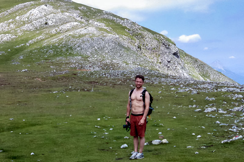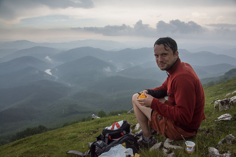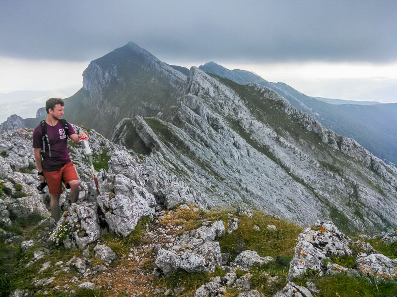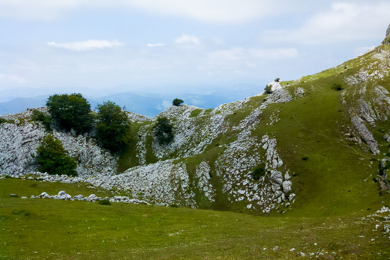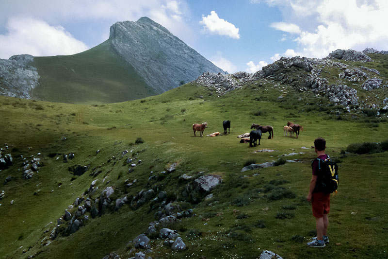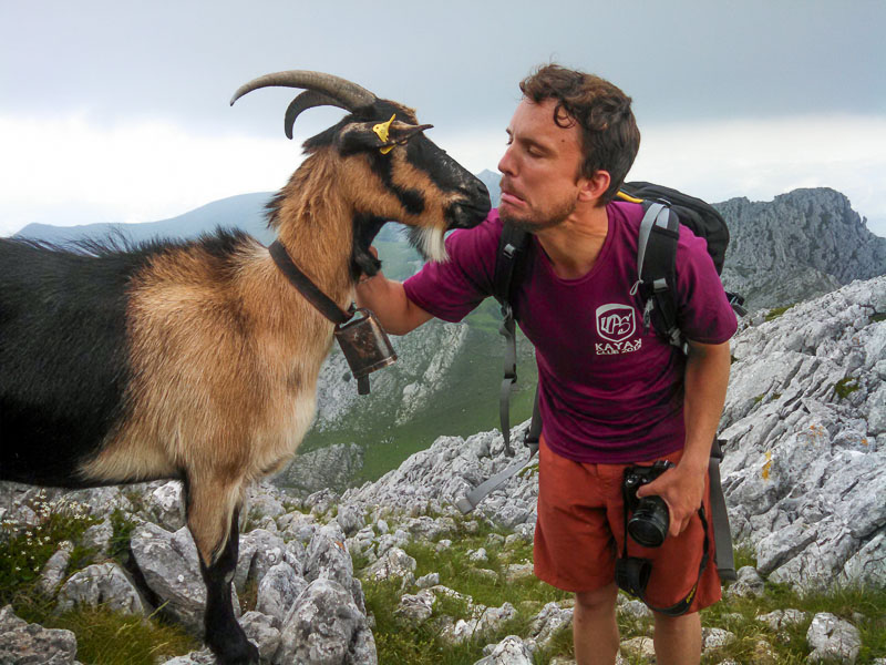 We reached the ridge at a large flat meadow, a pass between peaks named Arriurdin and Artzanburur on the map. Two trails cross there. We hiked up to a meadow band just below the crest of the ridge and followed it east over gentle terrain to an imperceptible summit named Aizlear from which we could see three higher peaks ahead. The weather was changing and the second two peaks were partially obscured by gray stratus. The first of the three peaks was a blocky gray crag named Andreaitz which we avoided by following a trail through the rough limestone capping the ridge. It dropped quickly into a vast meadow on the south side of the ridge. We traversed up to a low saddle in which a small herd of friendly horses grazed next to a big green sinkhole. From there we could see the second peak, an sharp crag at the top of a long sloping meadow. We considered bypassing it on the right but the meadows on the north side of the ridge were extremely steep so from the top of the meadow we scrambled up into the gray rock. A small group of friendly goats met us there and posed for photos with us.