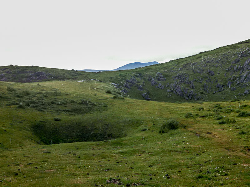 The terrain up high was rather odd. The range is basically a single ridge is composed of layers of massive limestone dipping steeply to the south-southwest with a single layer several hundred feet thick forming the spine of the ridge. The thinner layers below it apparently vary in hardness; softer layers are capped with meadows out of which the harder layers protrude in long parallel lines of outcrops. Sinkholes form pits scattered all across the range, some a couple hundred feet across and fifty feet deep, others as small as five or ten feet across and a few feet deep. Pits in craggy areas are lined with fallen rock but in meadows, they're carpeted with close-cropped grass and often shelter a clump of stinging nettles in their depths. In aerial photos taken in early spring, the pits stand out as circular or crescent-shaped spots of snow.