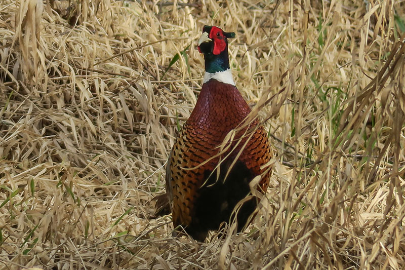 The Swamp Sparrow at Stillwater out in the Snoqualmie Valley is still being reported so we went to see it. I wasn't sure I could make it out there but it turned out to be only a half mile round-trip - no problem. We might not have found it had not a couple of other birders pointed out to us. We had been looking in the area where we saw it last fall but this time it was 50 yards back towards the trailhead. Last fall we only heard it but today it offered good views (at least to those with binoculars) and Darchelle got photos. She also got photos of a pheasant which flew in while we were looking for the sparrow.