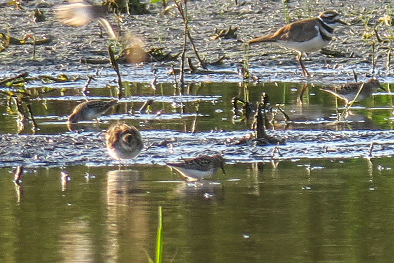 An intense rain shower would be there a couple of minutes later. We huddled under Walter's pine trees and waited it out. After the rain tapered off a small green hummingbird appeared at the feeder. "Hummingbird at the feeder! Hummingbird at the feeder!", I called out. "It's the bird!", someone else confirmed. Darchelle was ready, having pre-focused the camera on the feeder. She crouched down but just as she went for the shot, Maxine stepped in front of her and inadvertently blocked her view. The hummingbird retreated to the top of the dead poplar where Darchelle was able to get a few photos but the light was low by that point.