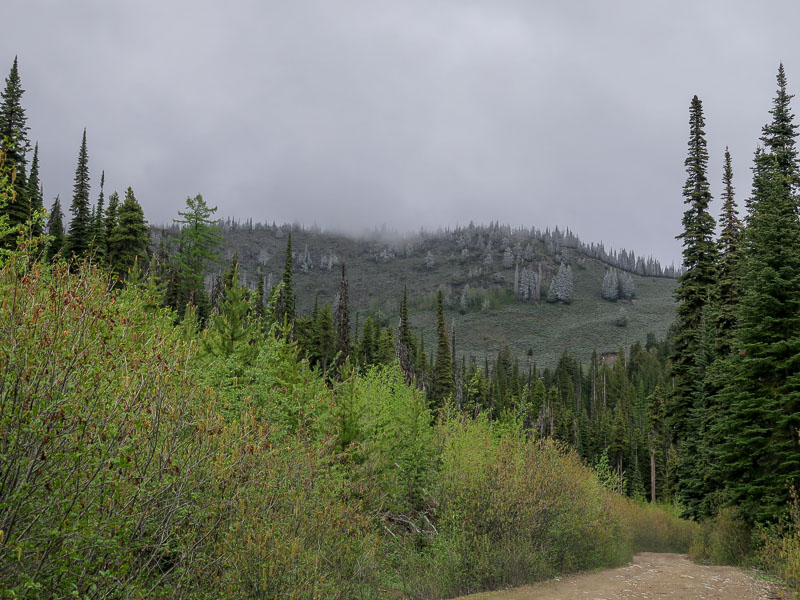 Despite the late hour, sometime around 7:30PM, when we reached Albian Hill Road on the east side of Sherman Pass, we drove up there anyhow and cruised very slowly through the Lodgepole Pine forest hoping that a Spruce Grouse might deign to show itself. It didn't. We were a little surprised to see snow on the hills above us. By the time we turned around at the Old Stagecoach Trailhead we were at the snow line ourselves, and about 20 minutes past our predetermined turnaround time. We pulled into Republic at dusk and booked a room at the Klondike despite the recent COVID outbreak in Ferry County. It had been a long day and we were tired.
