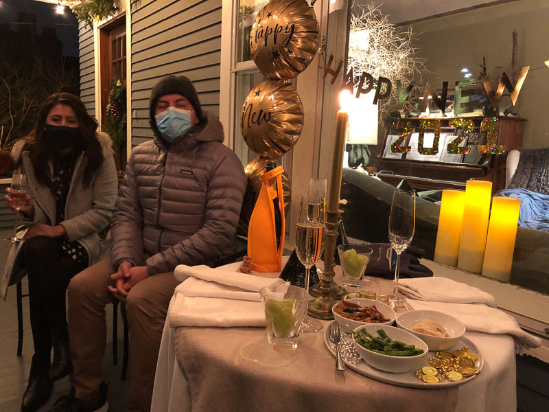 Our get together with Monica and Marco on the front porch was intended to be a New Year's Eve party but we ran late and made it out just in time to hear the neighborhood erupt in cheers and fireworks. We joined in the cheers, rejoicing with our neighbors at the passing of a difficult year - and it wasn't even that difficult for us. Certainly getting together with friends became more uncomfortable as the weather grew colder this fall but we still managed. We FaceTimed with Mom and John and Zoomed with Darchelle's family including an epic festival of present-opening for Christmas. Darchelle worked from home which worked for us as well because it allowed her to check up on me periodically. We spent almost all of our time together and that worked too because we generally prefer each other's company to anyone else's. Nonetheless we celebrated the demise of 2020 in anticipation of hanging out with family and friends indoors again in 2021.