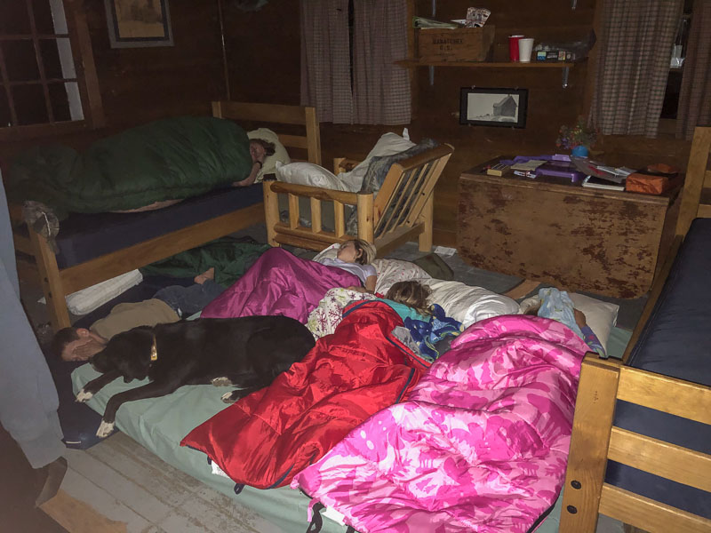 Darchelle and I had a private bedroom while Sally and her tribe spread out in the main room. Somehow Tug managed to claim the place of honor right in front of the stove. Morning was overcast and foggy which may have helped the kids sleep in a little. Having a separate room helped us sleep in a little more. Sally and Thomas fixed fat gooey pancakes for the rest of us.