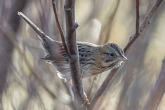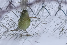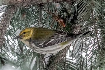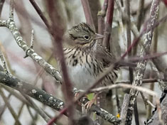 My willingness did not extend to a predawn departure so we did not reach Bill's Spit l+ until after 11, still early enough, I assured Darchelle, to find the warbler. She parked me at the overlook and walked out to the bare tree on the spit. It was not far, maybe 60 yards. I could hear her playing the recording of Palm Warbler calls and after a while, I even heard it respond, or was it a Fox sparrow? She had a glimpse of the bird in the dense brush along the shore and was pretty sure it was The Bird but it was nonetheless far from a definitive sighting.