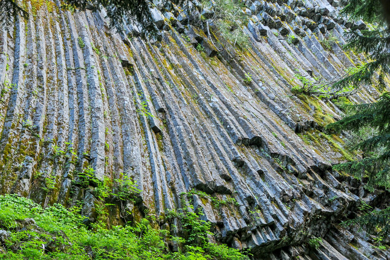 Lava, like most liquids other than water, shrinks when it solidifies. Since the solid rock cannot stretch it cracks at regular intervals, the cracks functioning like expansion joints in concrete and forming four- to six-sided columns which run perpendicular to the surface of the flow. On the lower slopes of volcanoes such as Mount Rainier, new lava tends to flow down existing valleys. The fresh rock tends to be harder than the older rock of the ridges on either side of the valley so over time, the ridges erode away and become valleys themselves leaving the former valley-fill standing as a ridge between them. Much of the time while this is happening the valleys and ridges both, at least in Washington, are carpeted with lush coniferous forest such as that pictured in the background image.
