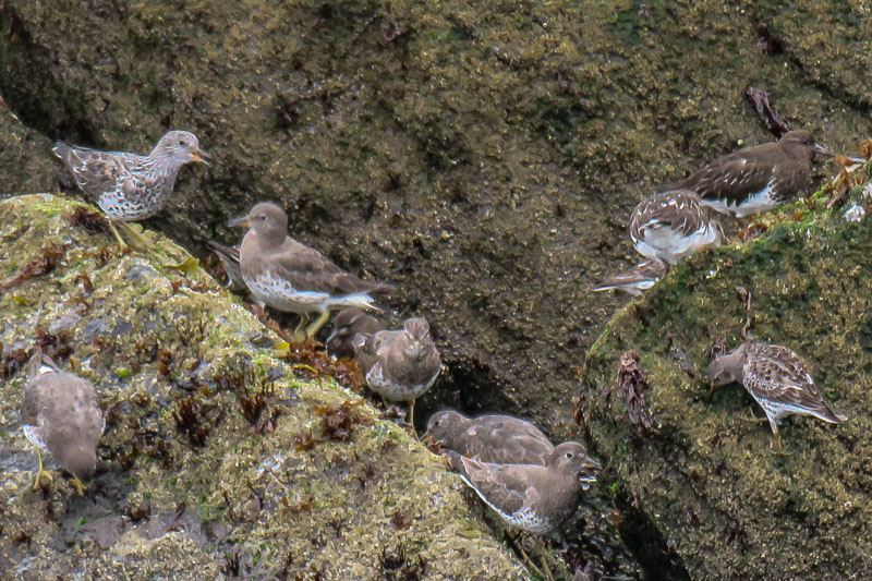 Surfbirds with Black Turnstone (ur) and Rock Sandpiper (lr) (03/22/2020)