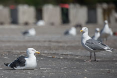 A half-hour later in Monroe I was driving the familiar farm roads south of town near Lake Crescent when I spotted a flock of gulls in the air. I had reason to hope; a couple of birders in a Prius had passed me as they were leaving and they'd seen the Glaucous Gull with other gulls in a nearby field. I stopped in a hurry to check out the wheeling flock and before I could manage to hoist my binoculars I spotted one creamy white gull among the darker Glaucous-wings. I dragged the camera off the back seat and braced my elbows on the hood of the car to prop up the lens. My photos were sufficient to reveal the dark tip on the pink bill, confirming the identification.